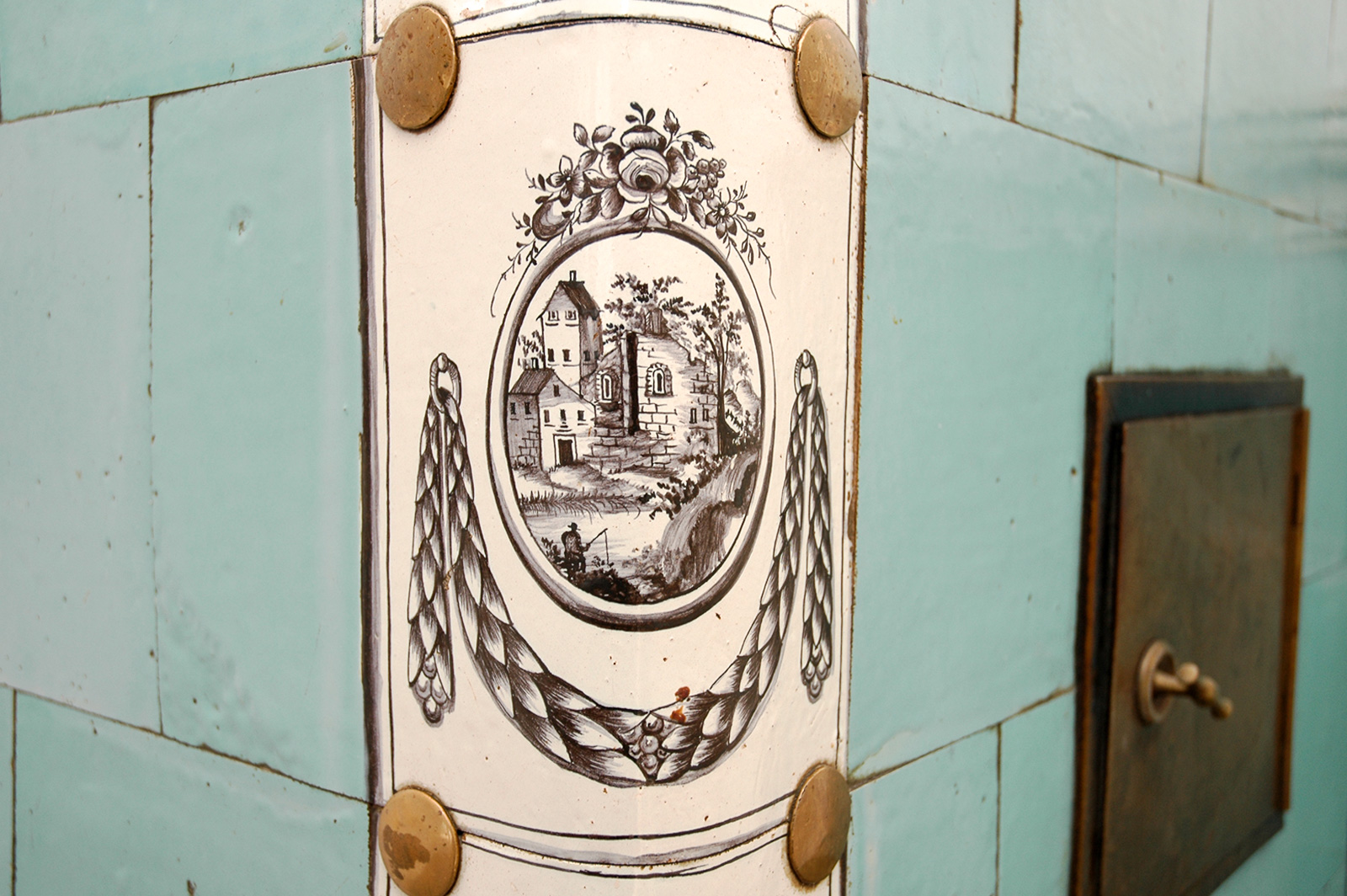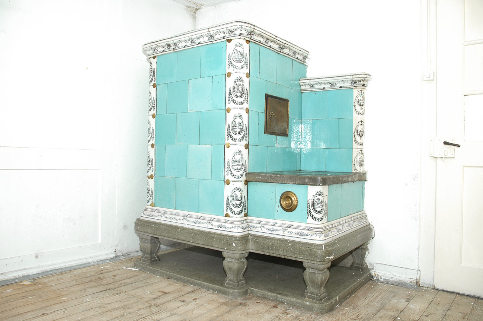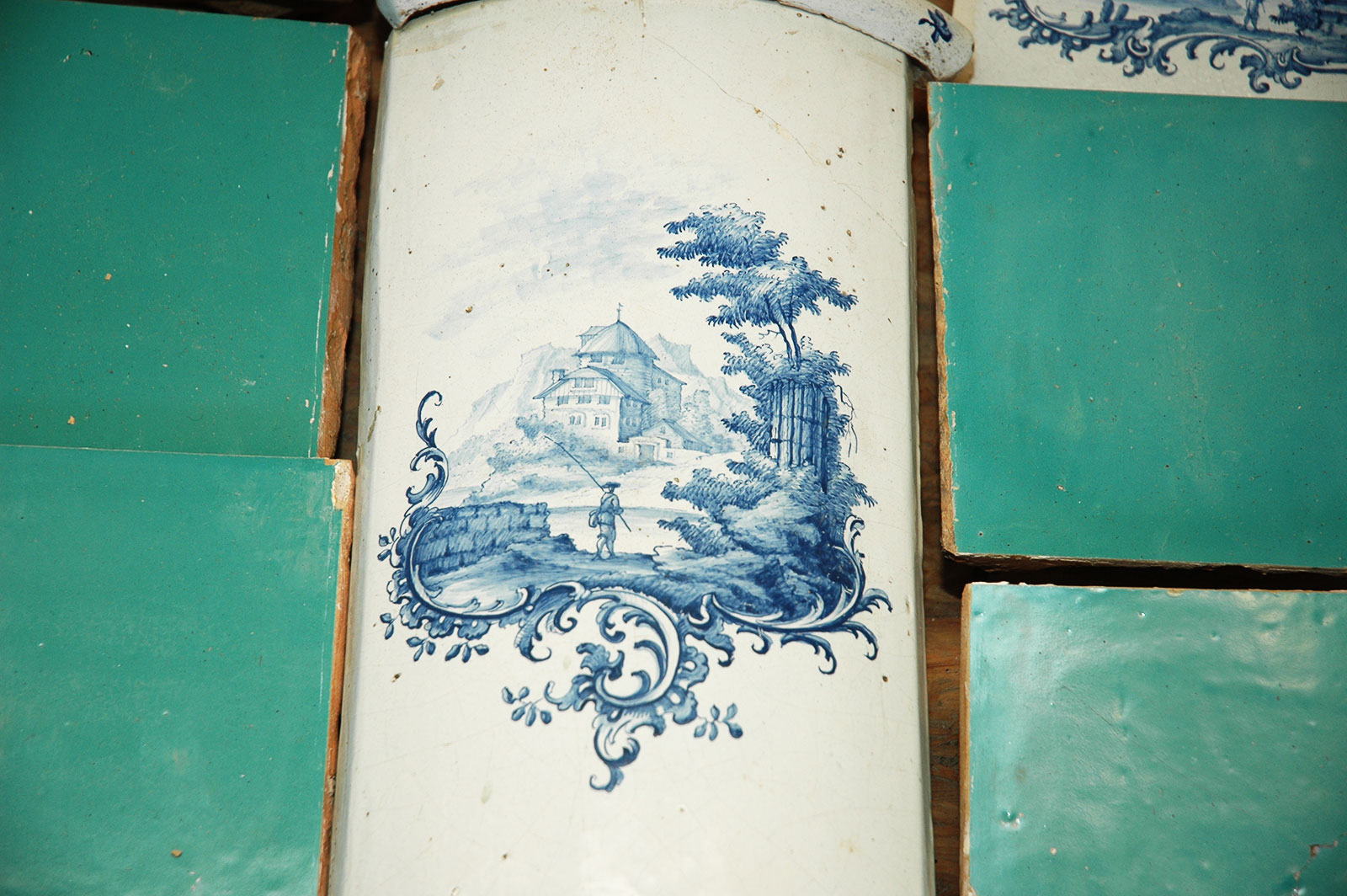 Sehr schöner blau-weiss bemalter Kachelofen mit türkisfarbenen Füllungen. Siehe auch „Kachelofen antik, Zunft zur Waag“
