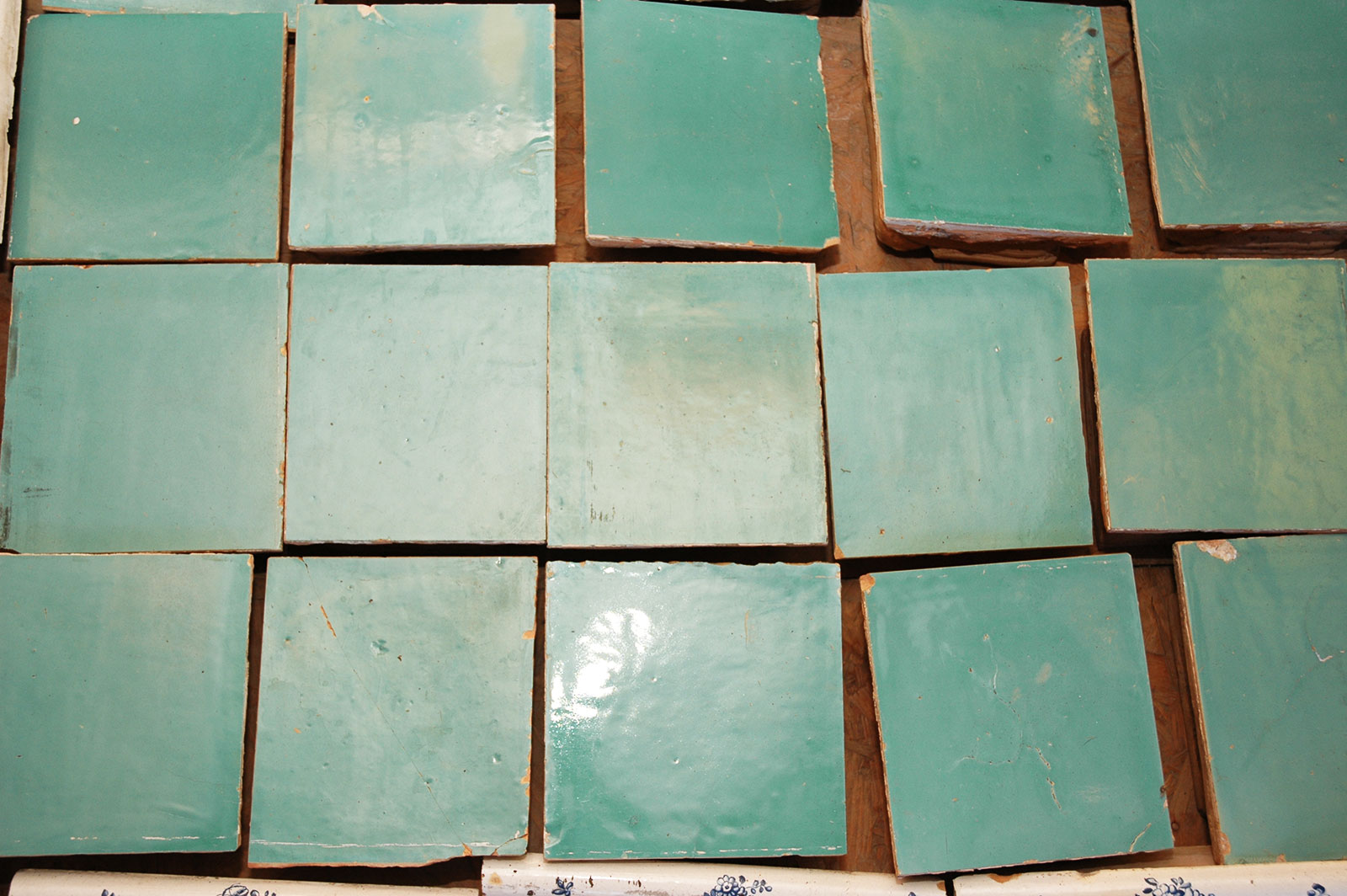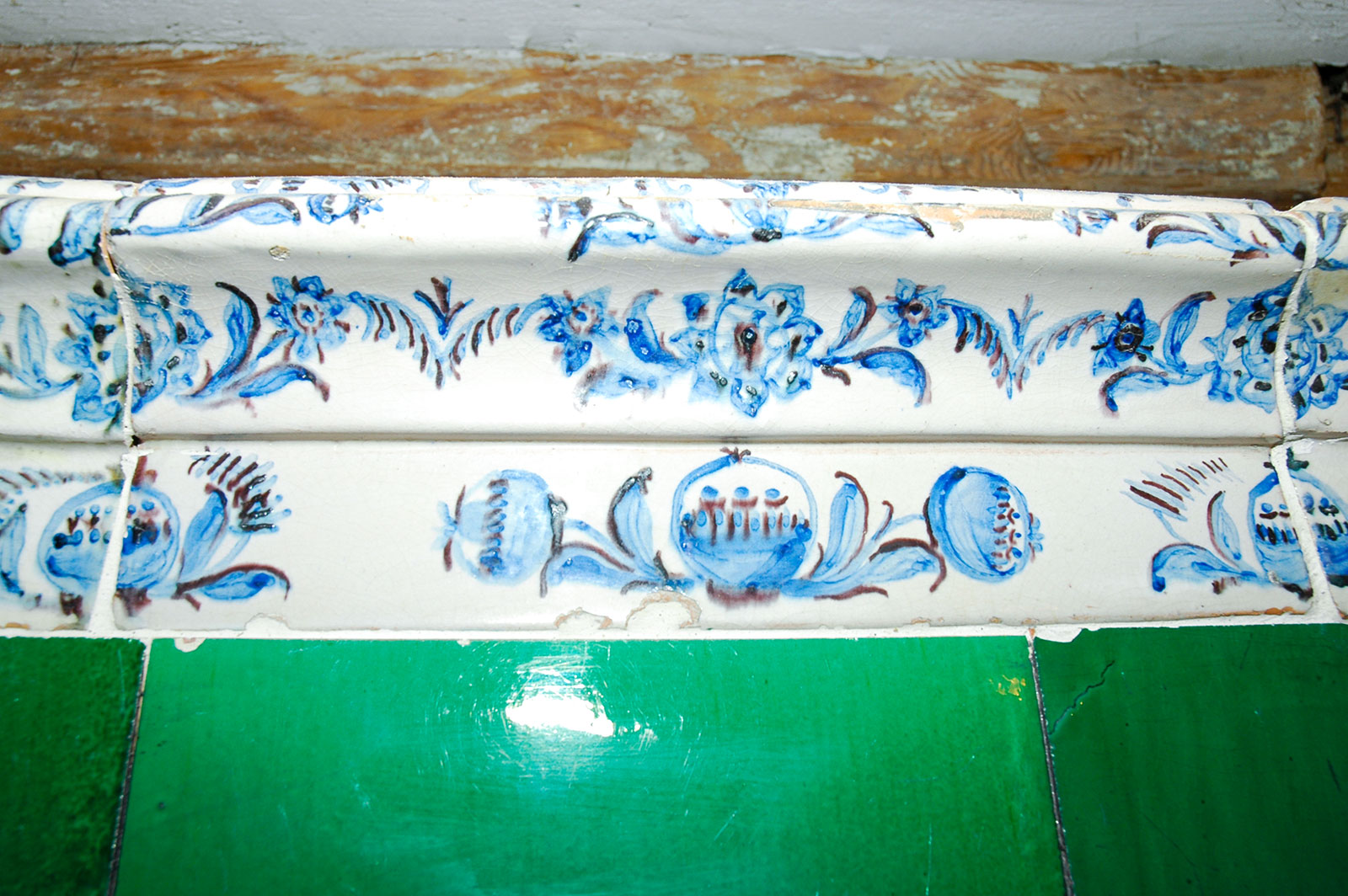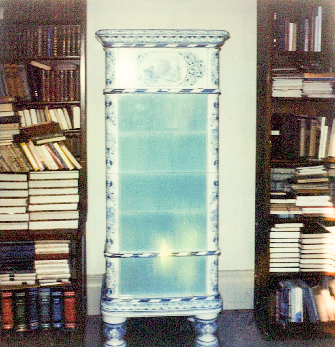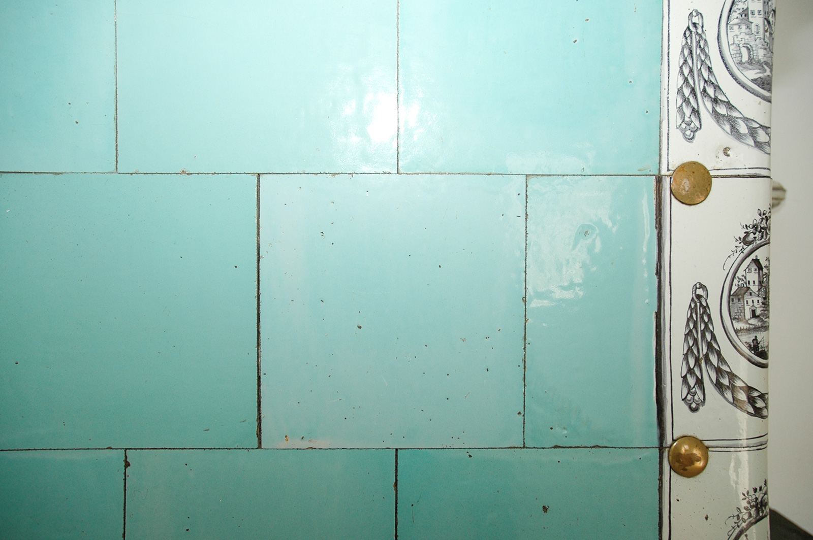 Sehr schöner blau-weiss bemalter Kachelofen mit türkisfarbenen Füllungen. Siehe auch „Kachelofen antik, Zunft zur Waag“