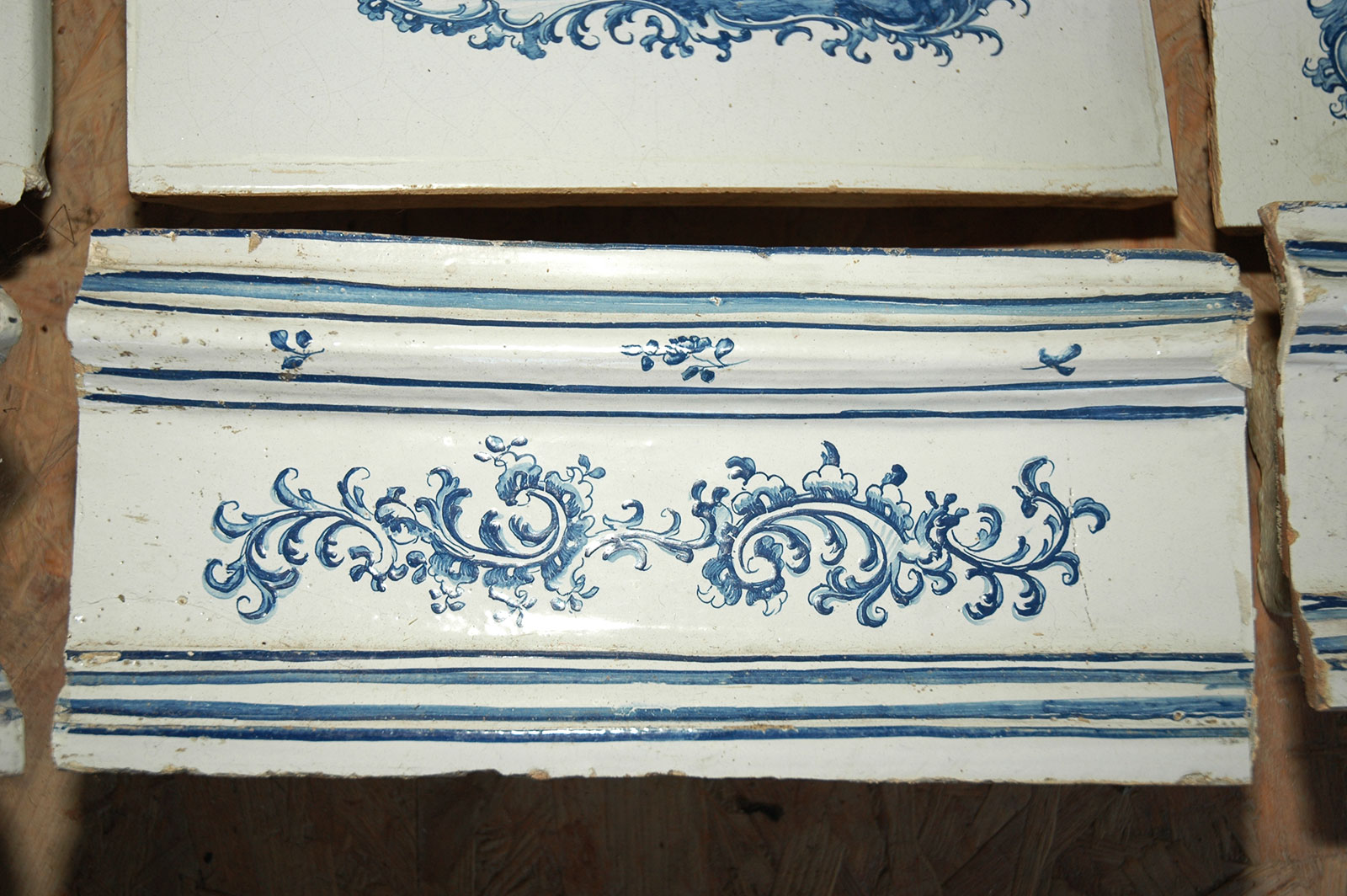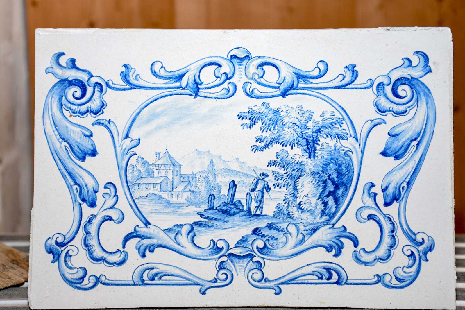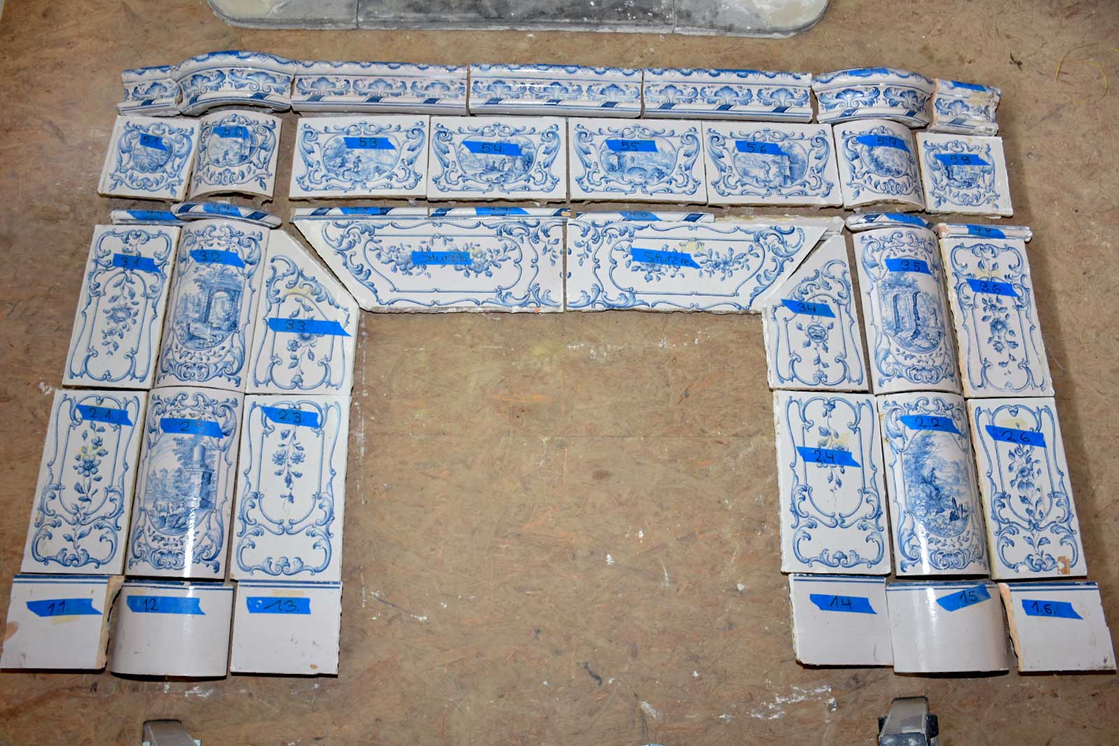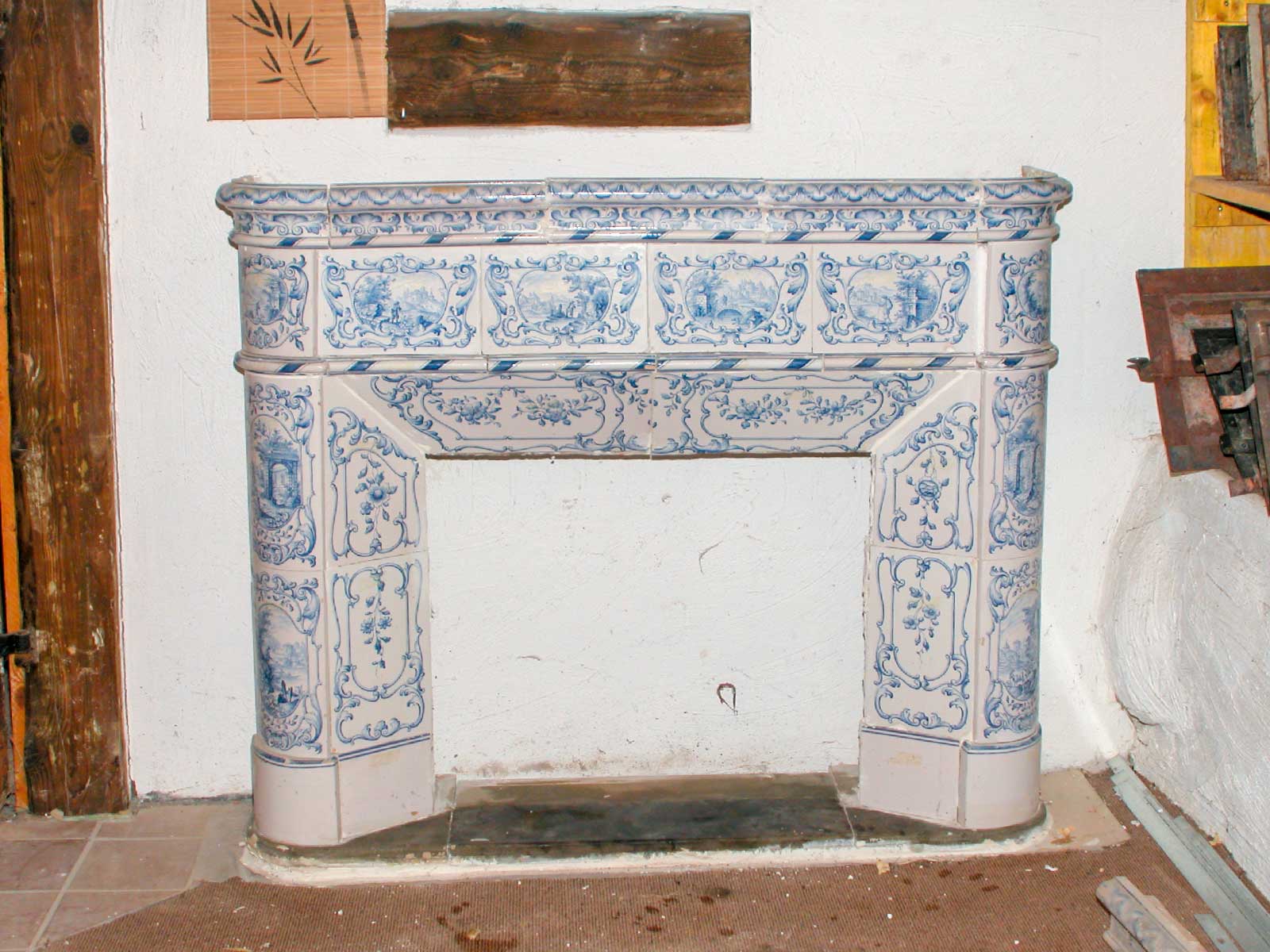 Cheminée Verkeidung aus blau-weiss bemalten Kacheln 19. Jh.