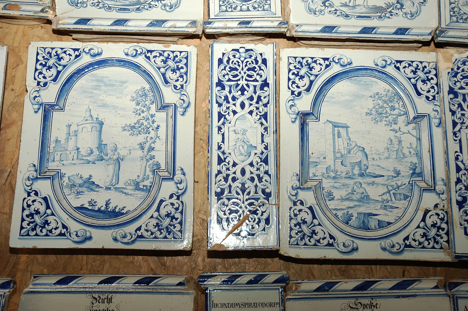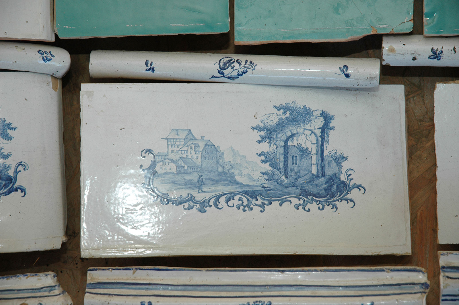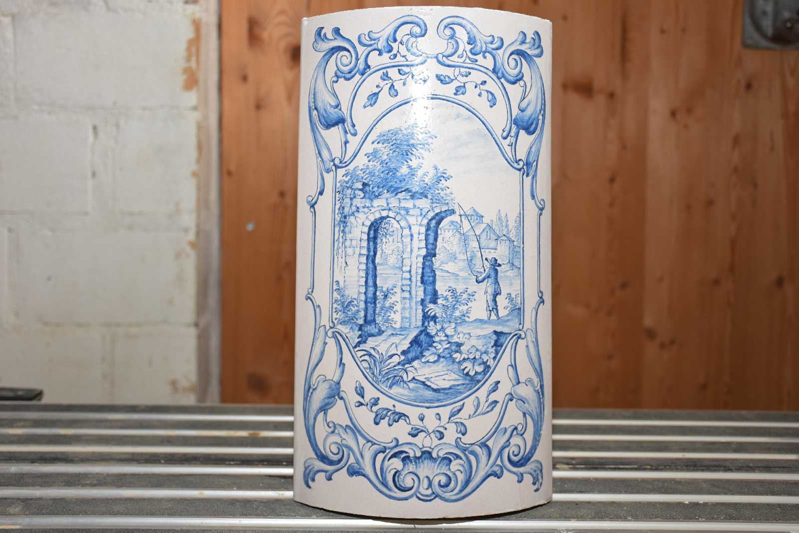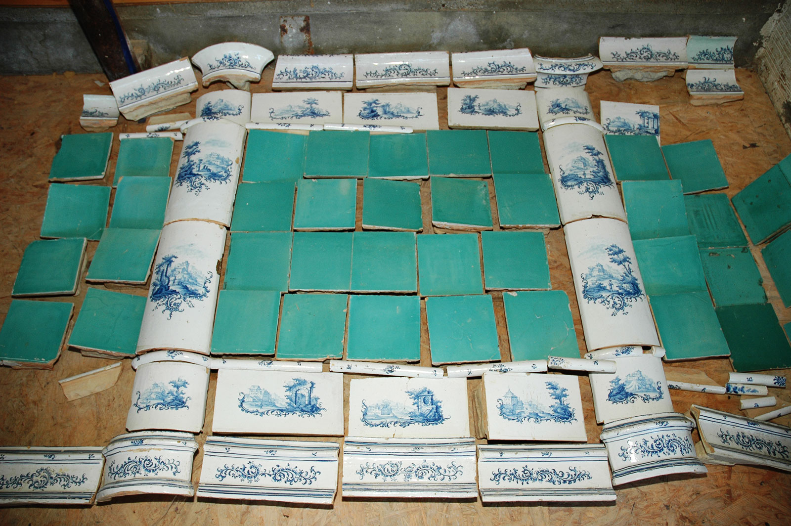 Cheminée Verkeidung aus blau-weiss bemalten Kacheln 19. Jh.