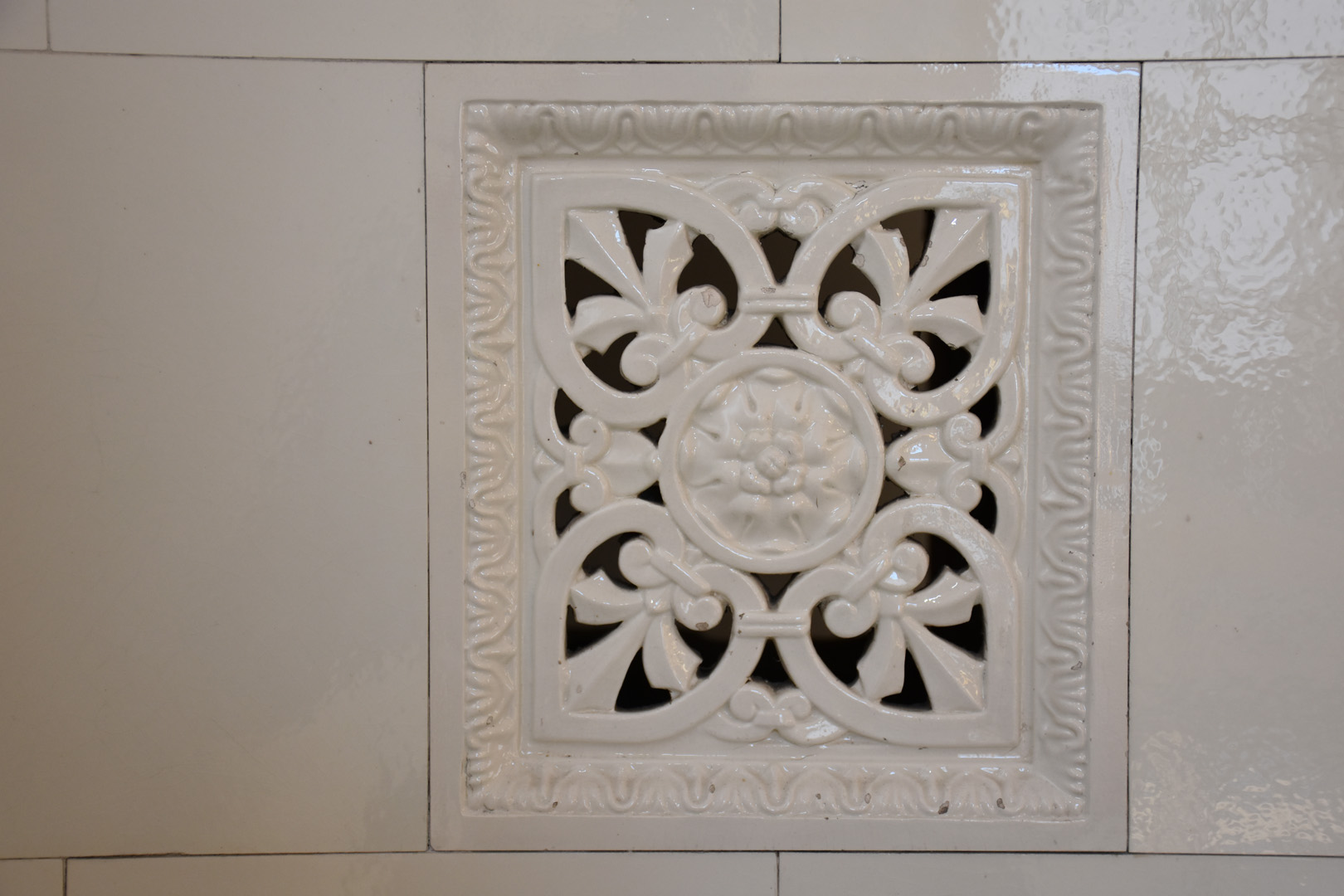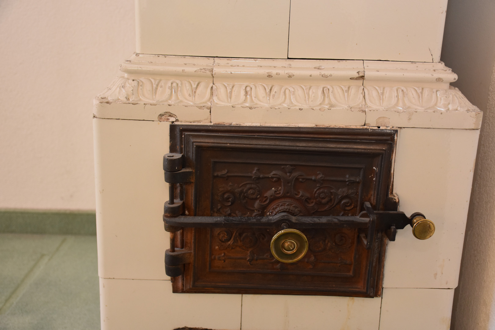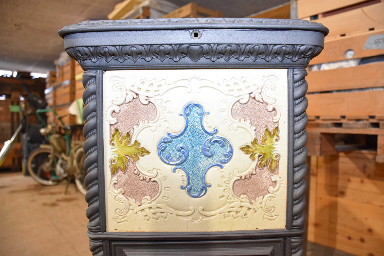 Wunderschöner Zimmerkachelofen mit Jugendstilkacheln und Gusselementen, alles Original.