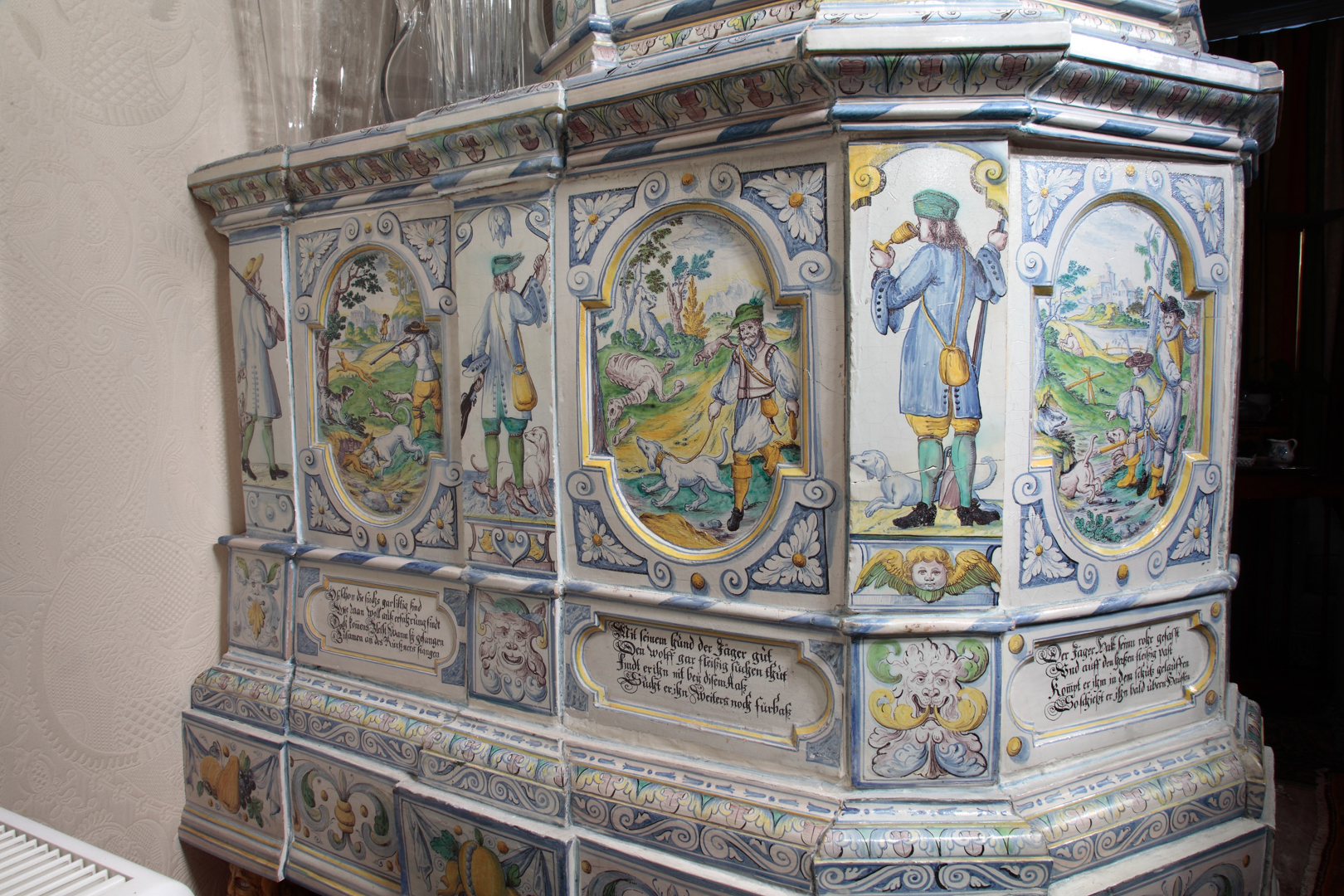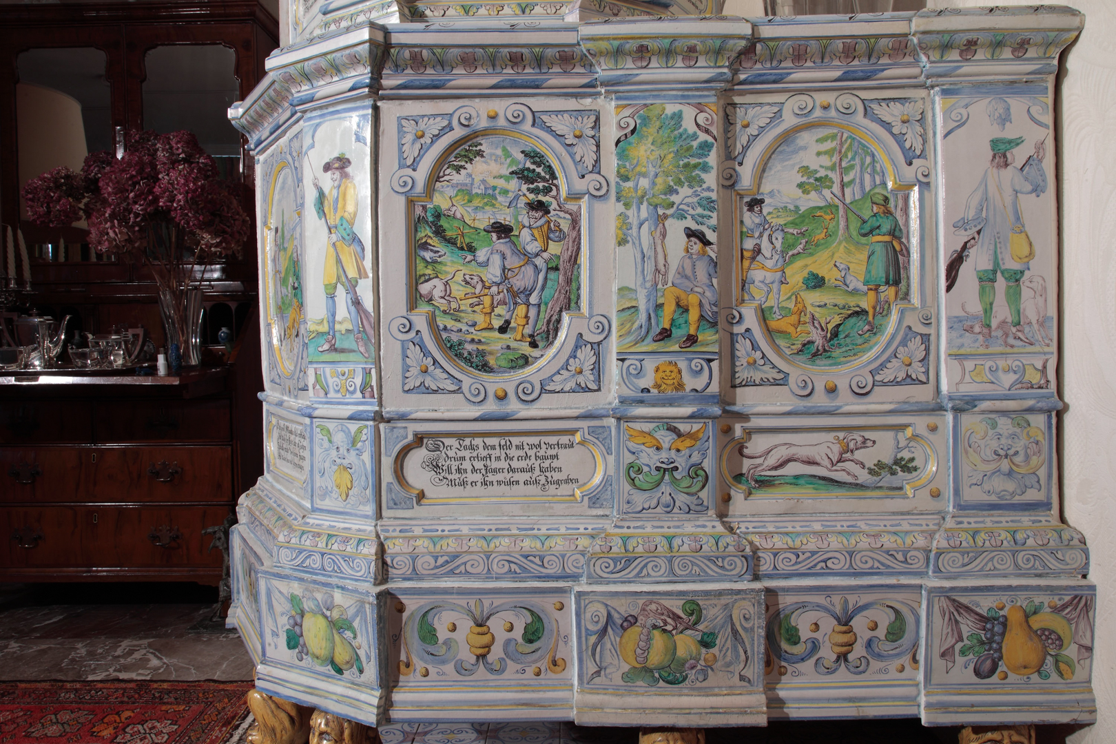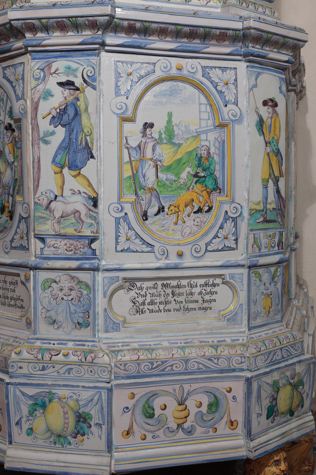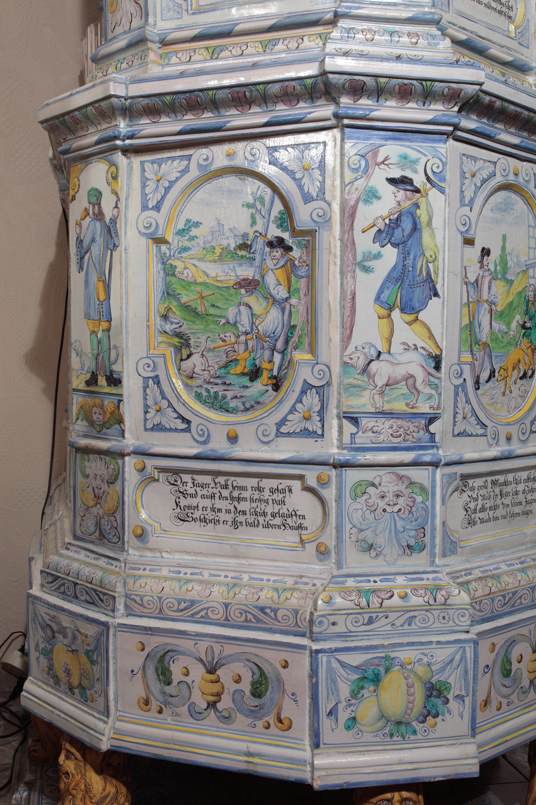 Wunderschöner Winterthurer Kachelofen der berühmten Familie Pfau, gemalt von David Sulzer, signiert und datiert 1741. Die Thematik ist Liebe, Glaube, Hoffnung – mit dazugehörigen Texten. Kann auch in anderer Form aufgebaut werden.