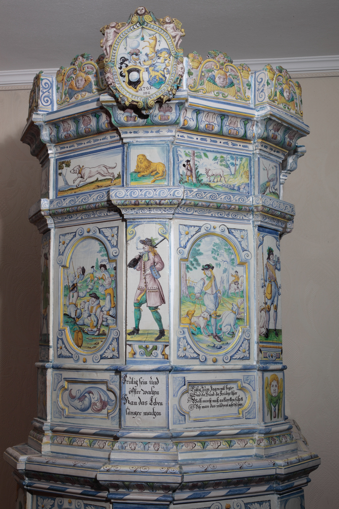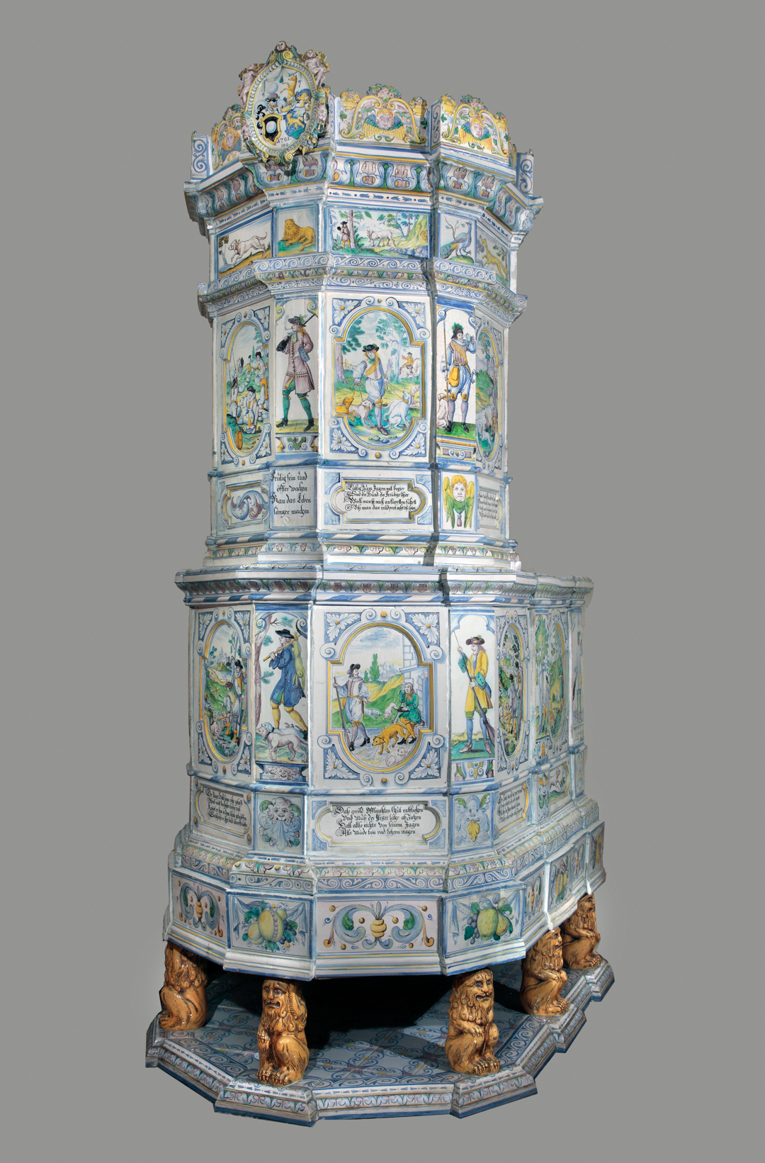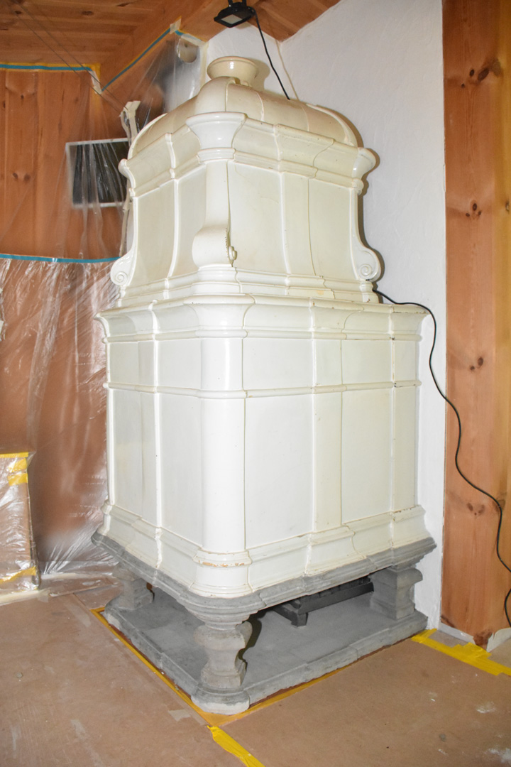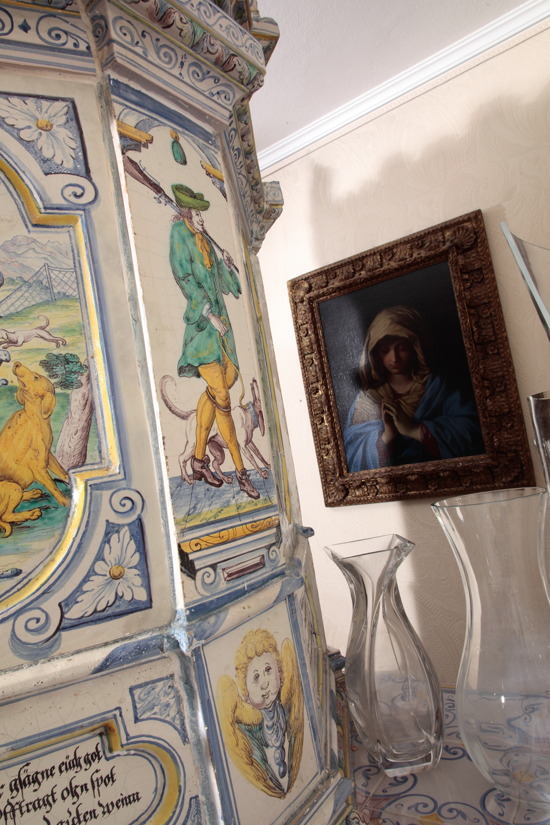 Wunderschöner Winterthurer Kachelofen der berühmten Familie Pfau, gemalt von David Sulzer, signiert und datiert 1741. Die Thematik ist Liebe, Glaube, Hoffnung – mit dazugehörigen Texten. Kann auch in anderer Form aufgebaut werden.