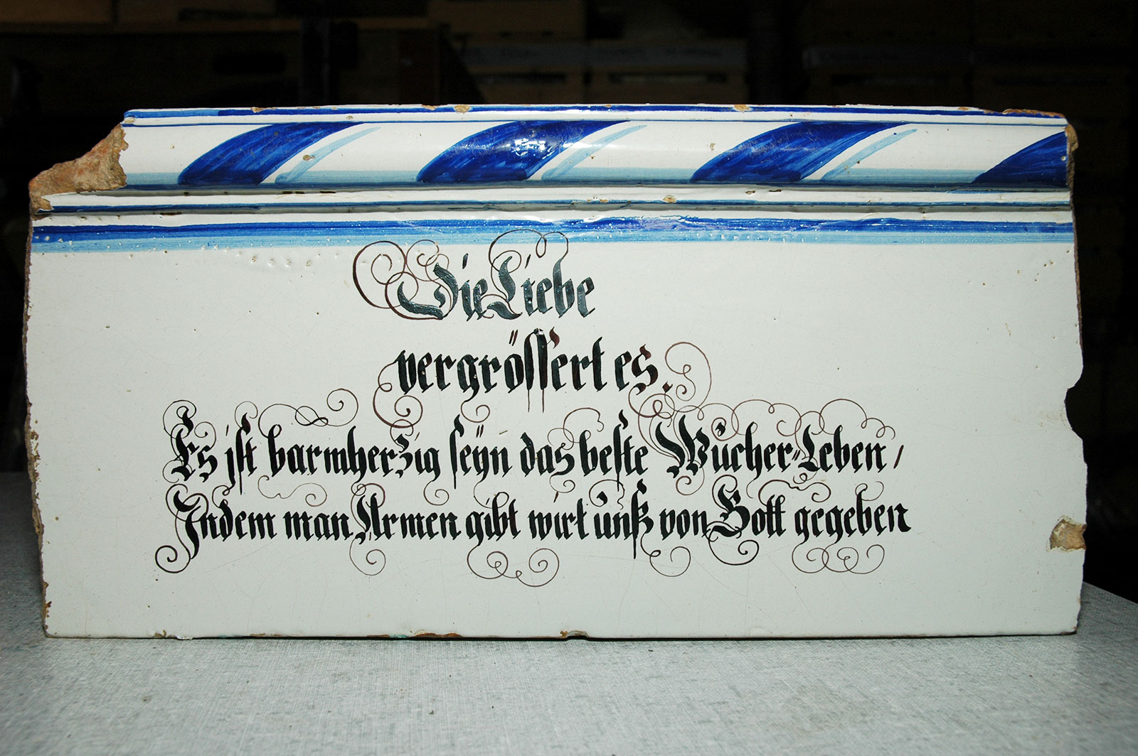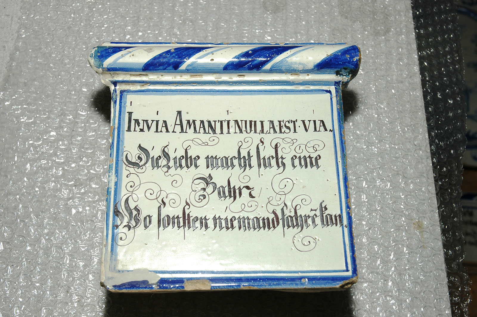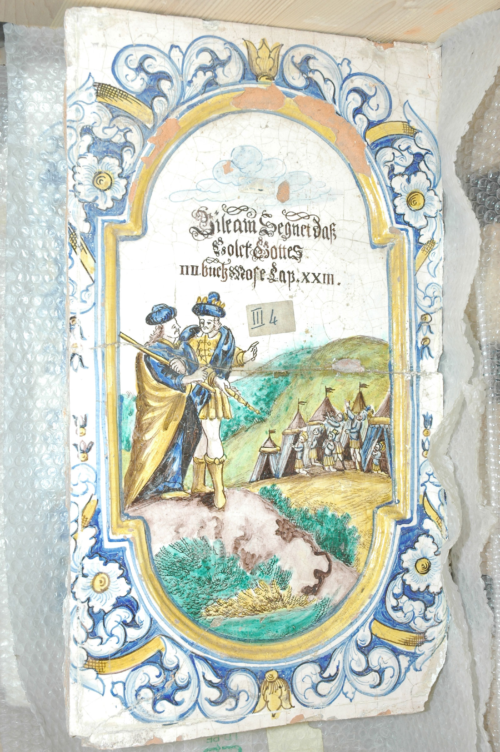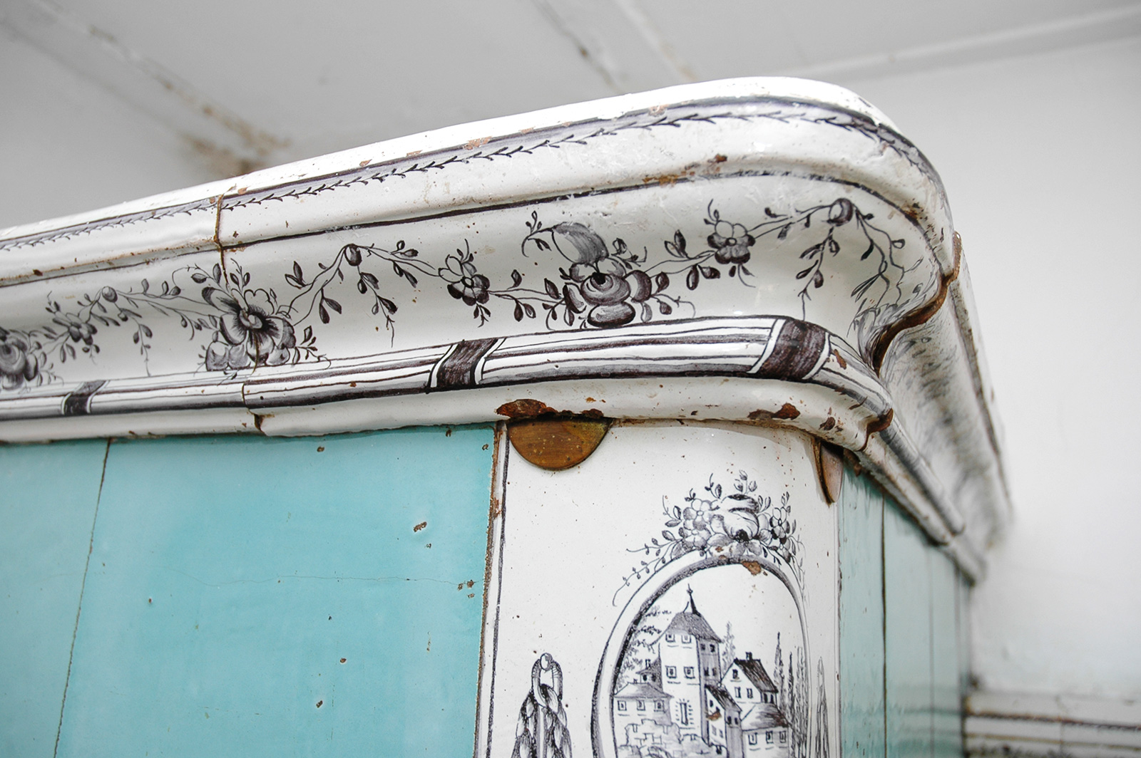 Wunderschöner Winterthurer Kachelofen der berühmten Familie Pfau, gemalt von David Sulzer, signiert und datiert 1741. Die Thematik ist Liebe, Glaube, Hoffnung – mit dazugehörigen Texten. Kann auch in anderer Form aufgebaut werden.