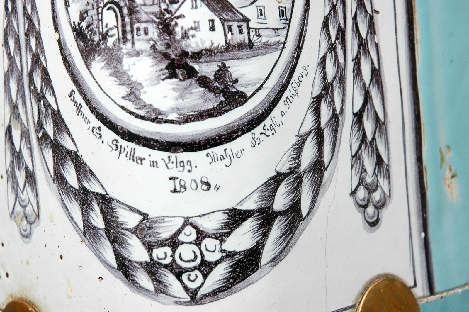 Schöner, seltener Kachelofen bemalt von H. Egli, Nussberg, Hafner Salomon Spiller, Elgg signiert und datiert 1808. Kann auch in etwas anderer Form aufgebaut werden.