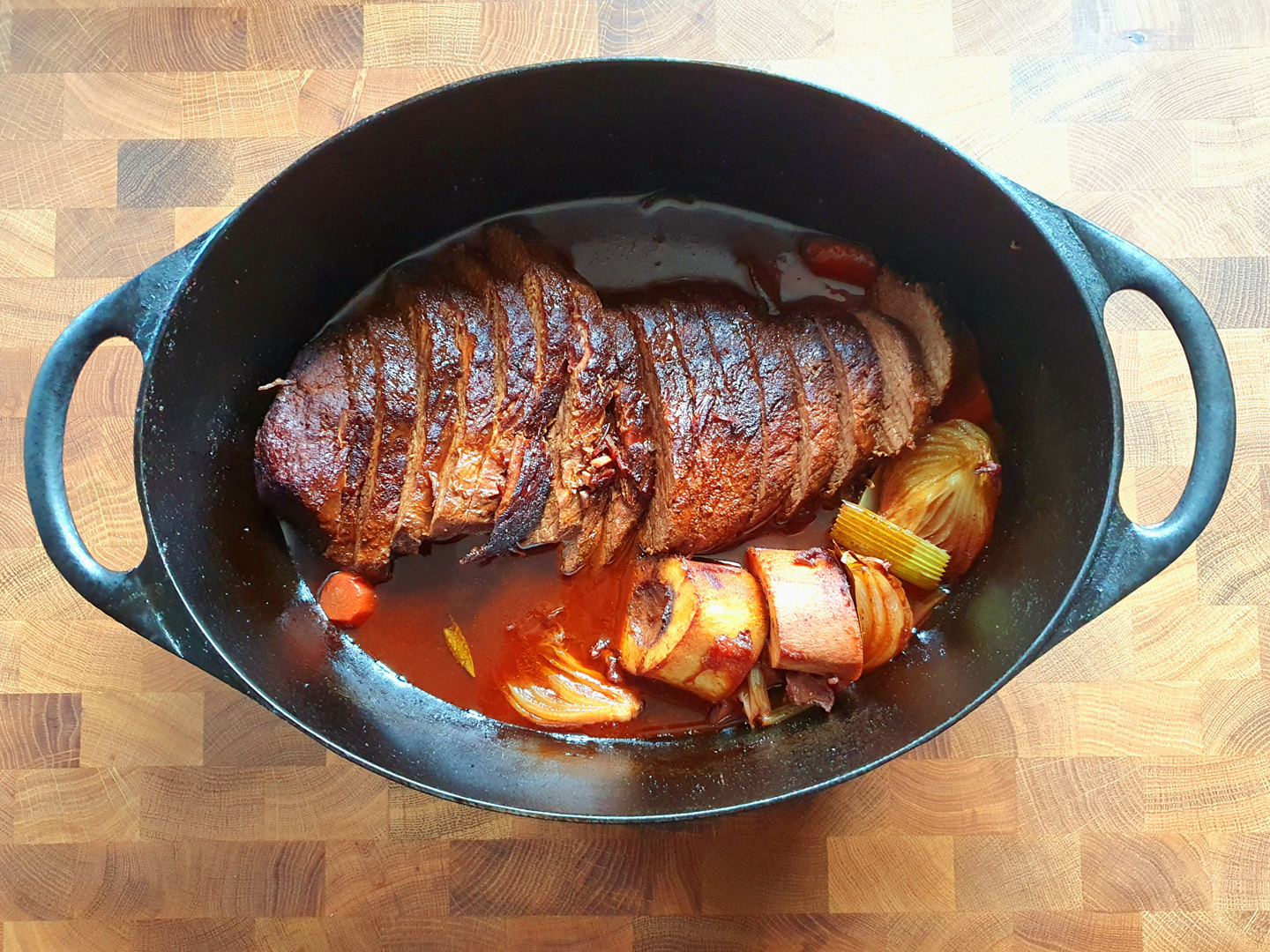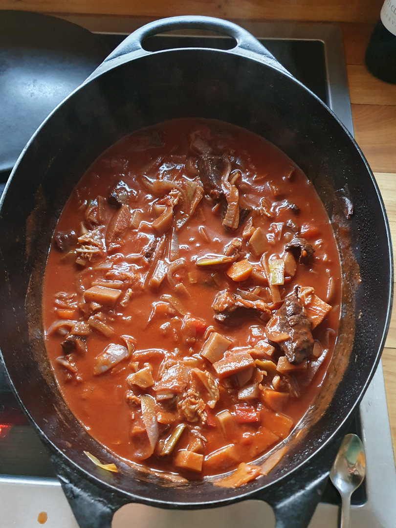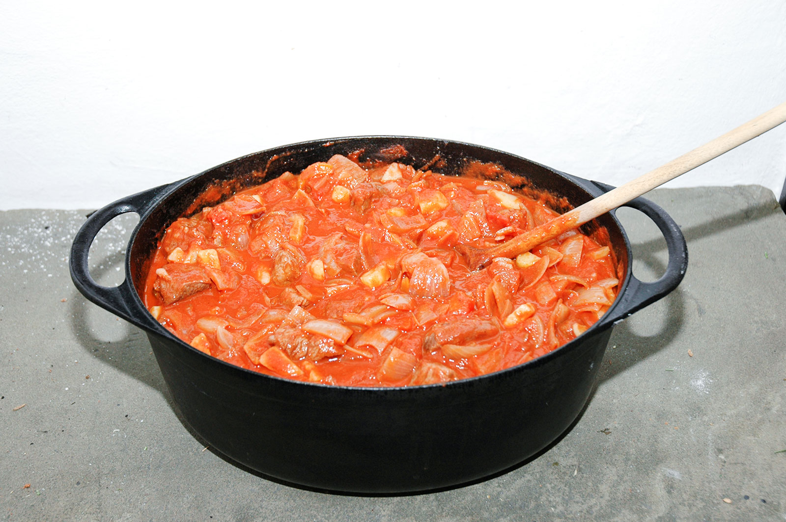- Erst jetzt die Zutaten mit Salz und Pfeffer würzen. Dann den Rotwein, die Bouillon sowie die Tomaten beifügen. Und die Suppe aufkochen. Die Lorbeerblätter mit den Nelken bestecken und dazugeben. Das Mehl mit wenig Flüssigkeit anrühren und in die Suppe geben. Diese zugedeckt je nach Fleischqualität 60 – 75 Minuten im Ofen kochen lassen.