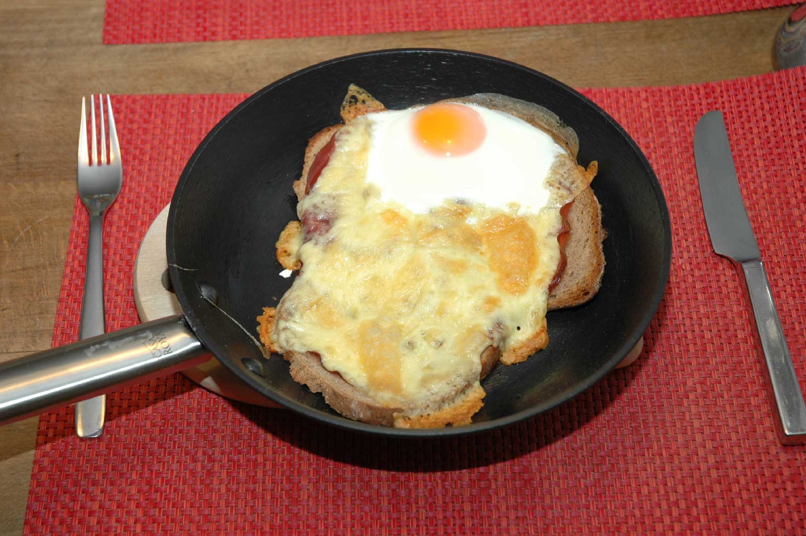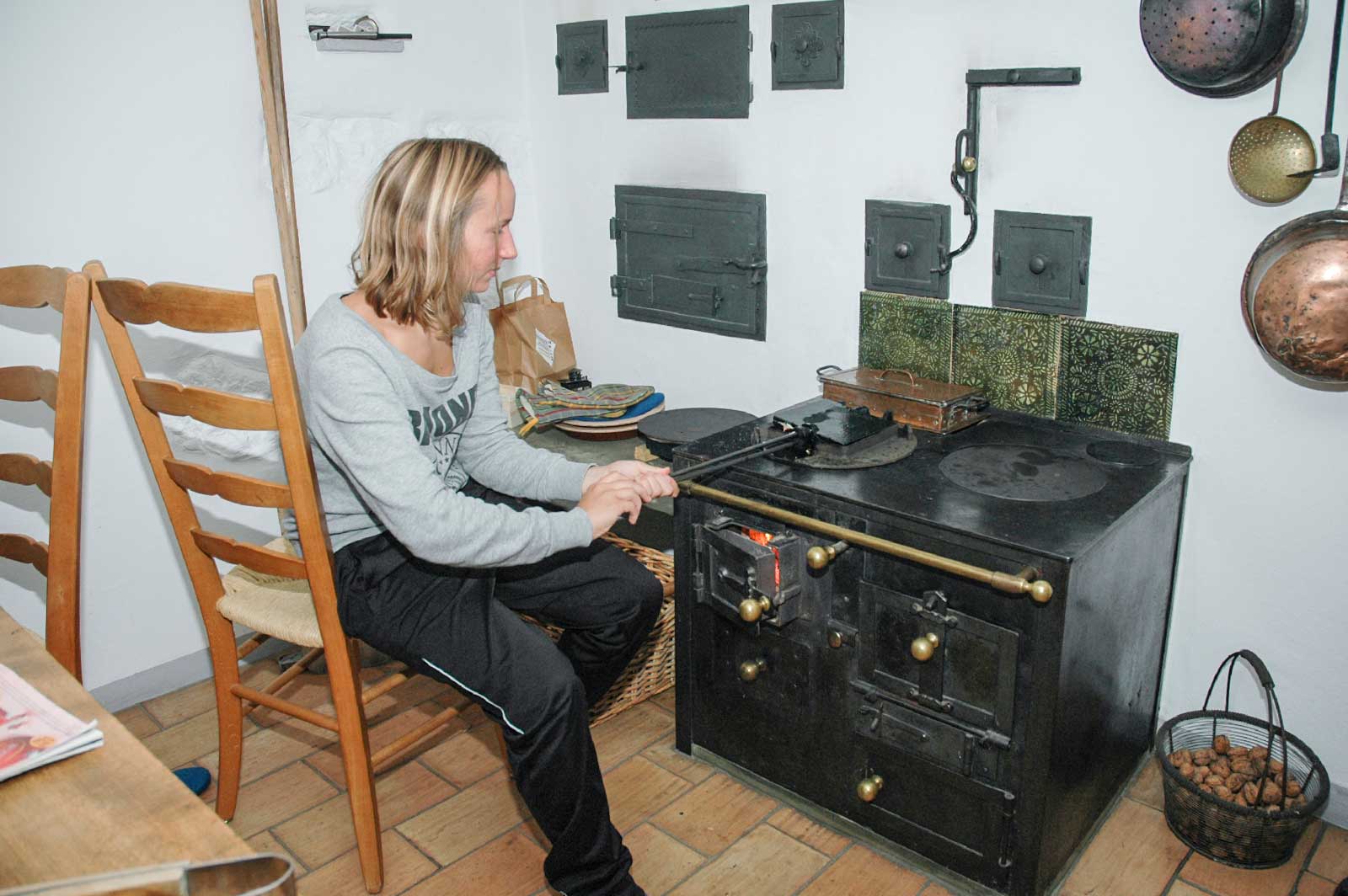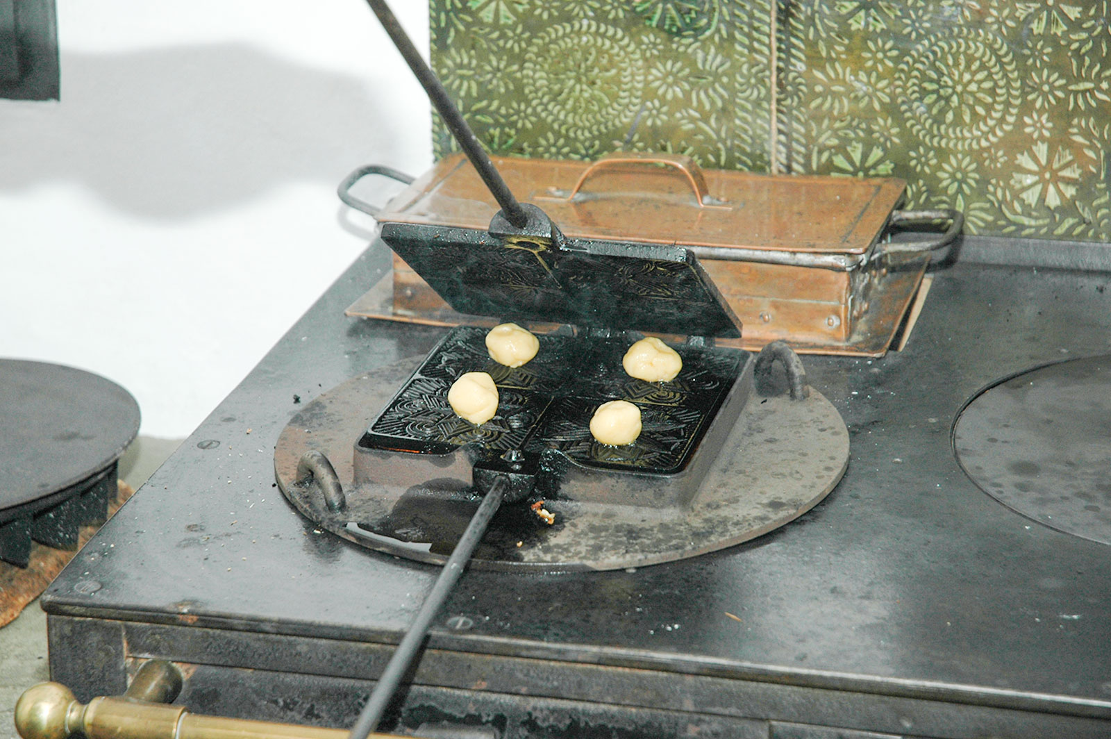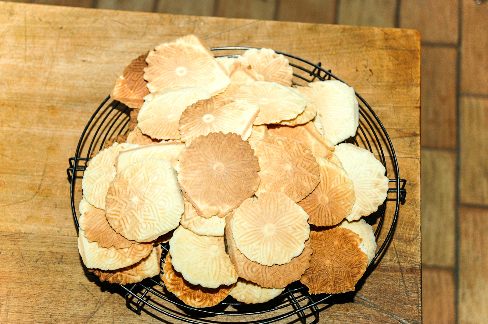 Das Feuer im Holzherd brennt in der Zwischenzeit, das Eisen erwärmen, etwas mit Butter bestreichen, den Teig zu 4 fast baumnussgrossen Kugeli formen, aufs Eisen legen und backen. Bei den nächsten Guetzli muss das Eisen nicht mehr mit Butter bestrichen werden.