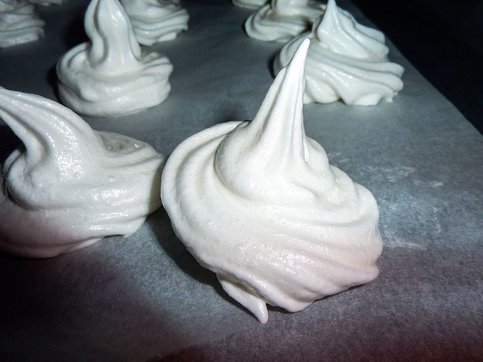 Masse in Dressiersack füllen und Meringues direkt aufs Blech spritzen. Über Nacht im Ofen trocknen lassen.