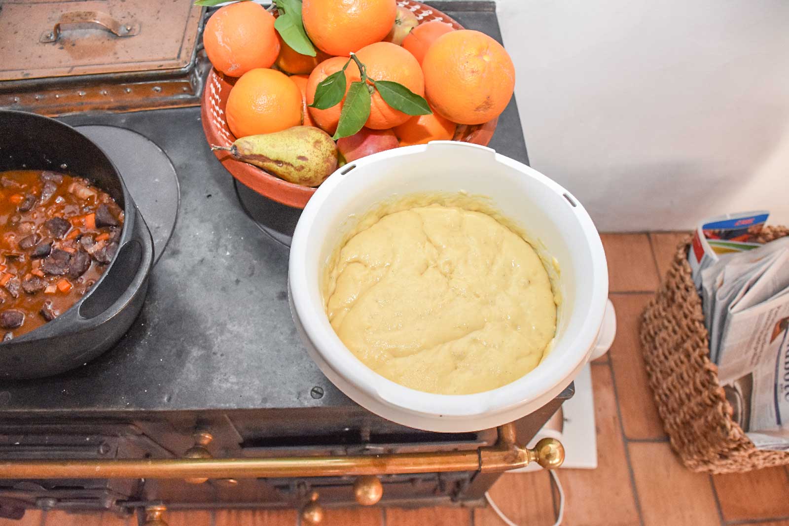 - Die Arbeitsfläche mit Mehl bestäuben. Den Teig aus der Schüssel nehmen und direkt auf das Mehl geben. Teig mit der Hand von jeder Seite her falten. Mit der Teignaht nach unten auf ein sauberes, stark bemehltes Küchentuch geben. Teig grosszügig bemehlen und 2 bis 3 Stunden ruhen lassen.