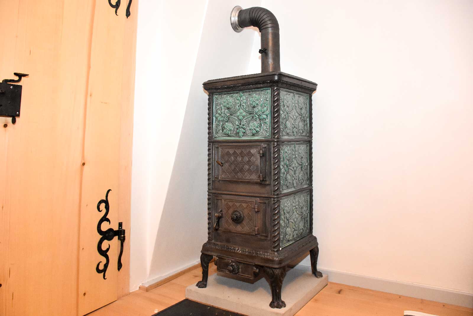 Kleinere Kachelöfen auf Füssen aus Gusseisen meist aus dem 20. Jahrhundert, mit hübschen Jugendstil- Kacheln und fein verzierten Türchen sind sogenannte Zimmeröfen. Diese Ofen-Art eignet sich ideal zum Heizen von einem Raum, oder als Zusatzheizung. Sie sind ein praktisches dezentes Schmuckstück im Wohnraum. Fredi Mathys restauriert solche Zimmeröfen voll funktionsfähig als Wärmequelle für ein schöneres Wohngefühl.