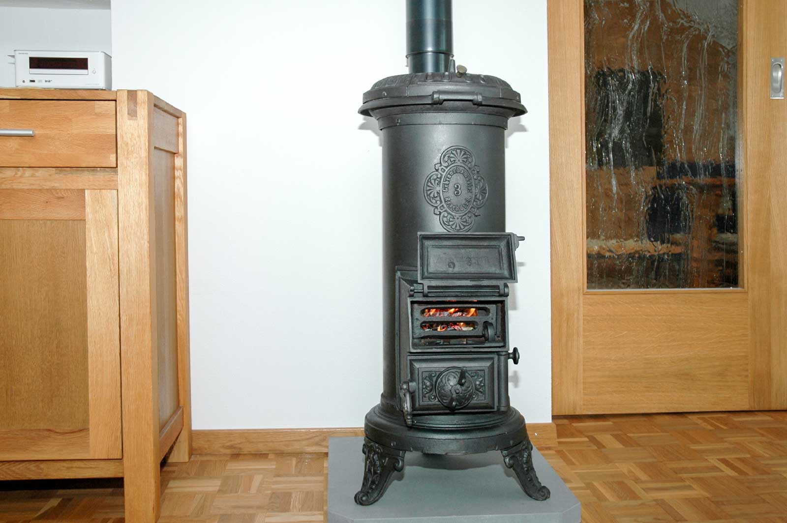 Mit einem antiken Zimmerofen haben Sie eine unabhängige und gemütliche Wärmequelle im Haus, die sich optimal als Holzheizung für einen Raum eignet. Der grosse Vorteil eines Zimmerofens: Die Anlagen lassen sich in ihre Einzelteile zerlegen, reinigen, flicken und anschliessend wieder zusammenbauen. So können Sie einen antiken Zimmerofen von Fredi Mathys mit einem neuen, technisch hochwertigen Innenausbau aus Schamotte und Lehm aufwerten lassen.