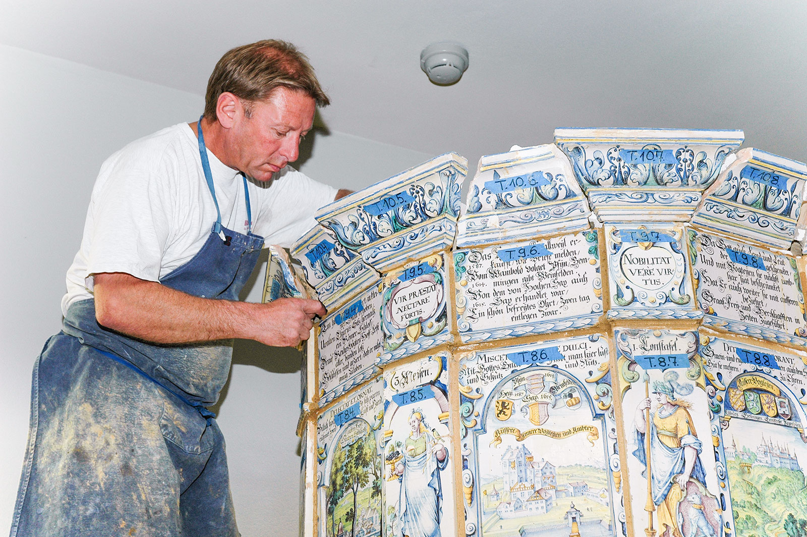 Restaurierung Kachelofen im Schlössli bei Ennetbaden Weil die Brennkammer kaputt ist, muss der Kachelofen Louis XVI im Schlössli auf- und abgebaut w…