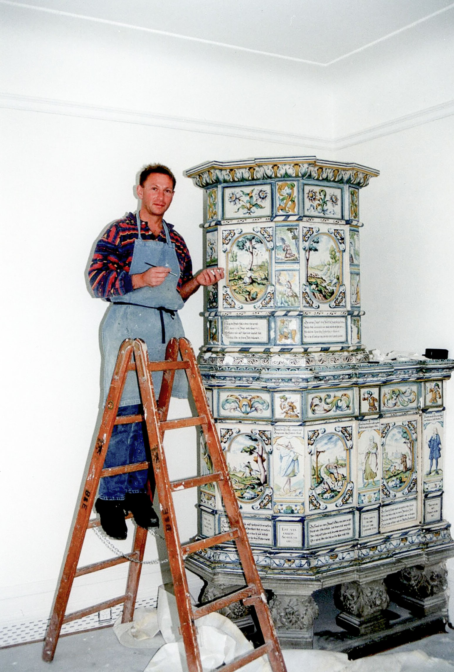 Hafner Fredi Mathys mit dem Zürcher Rathausofen Im Ennetbadener Schlössli ist der alte Kachelofen fachgerecht renoviert worden. Der histor…