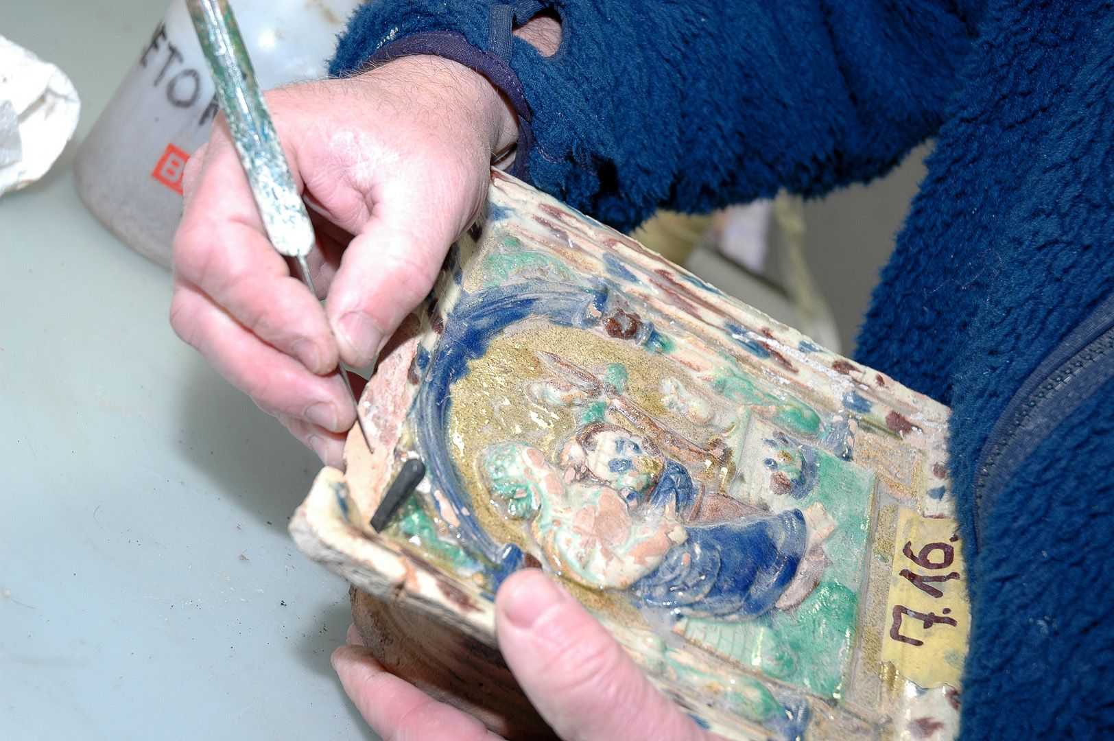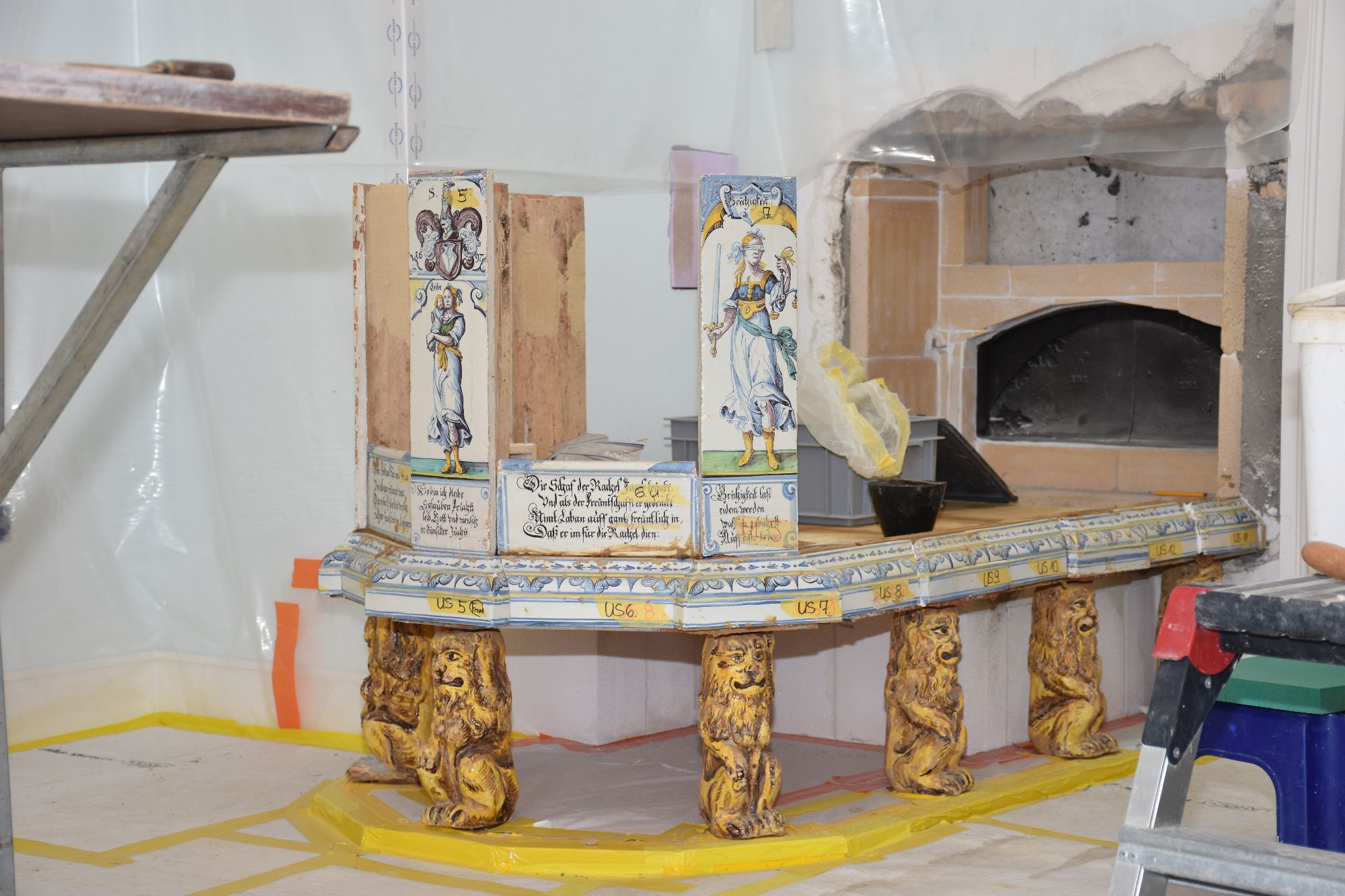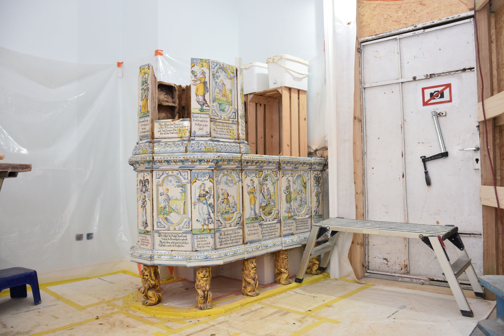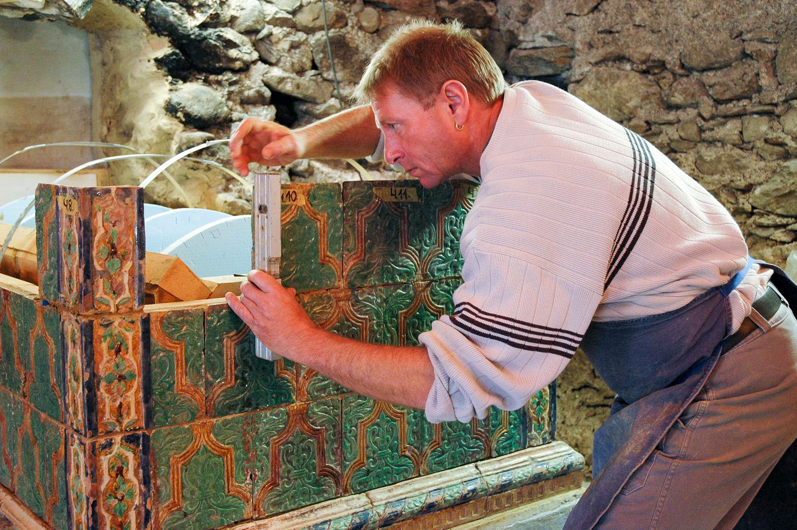 Bevor ein antiker Kachelofen wieder aufgebaut wird, erfolgt eine gründliche Reinigung der Ofenkacheln und eine technische Instandsetzung, um einen präzisen Aufbau und eine einwandfreie Statik zu gewährleisten. Nach dem Aufbau werden, falls erforderlich, Glasurabplatzungen an den Kacheln oder Übergänge zwischen einzelnen Kacheln sorgfältig retuschiert.