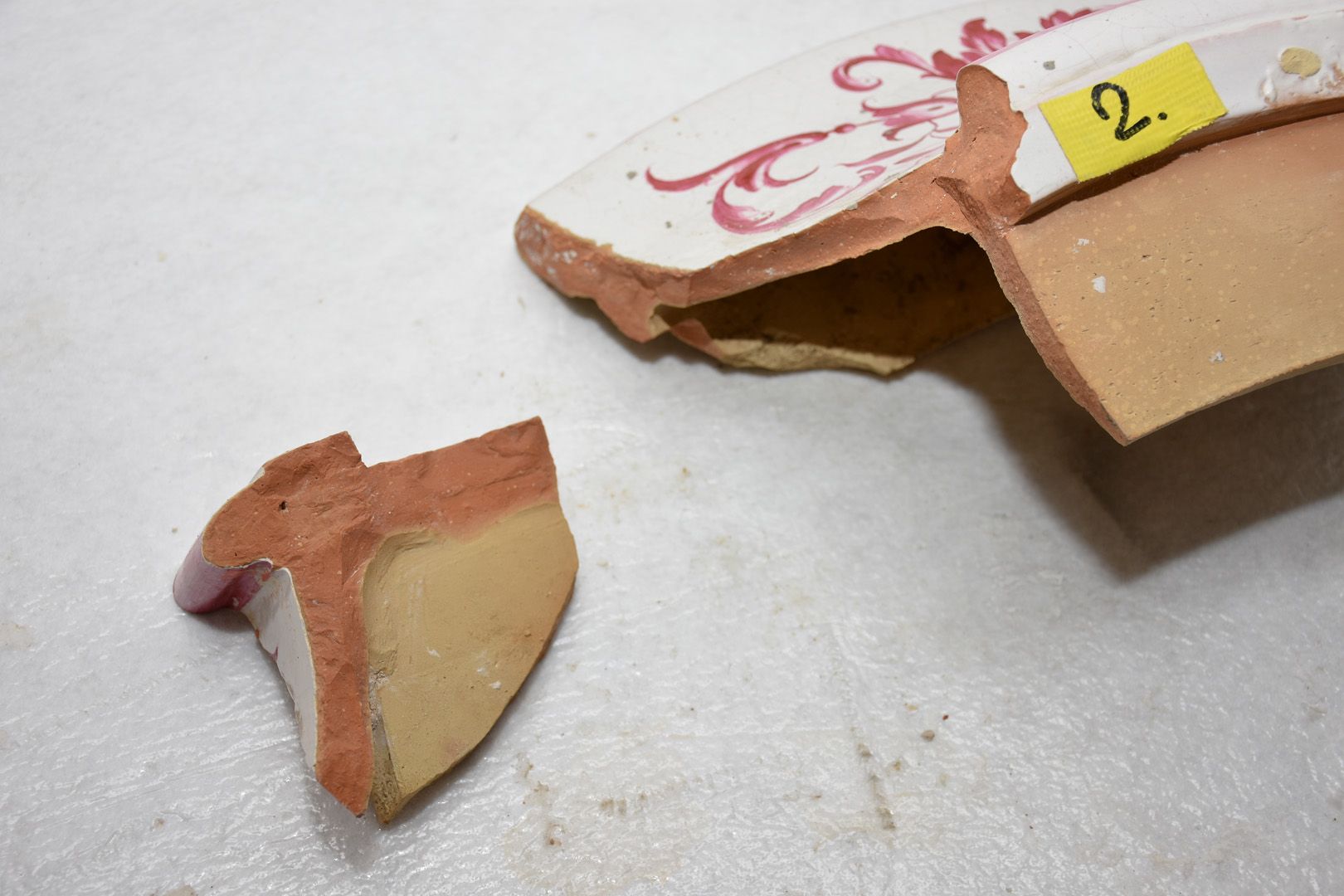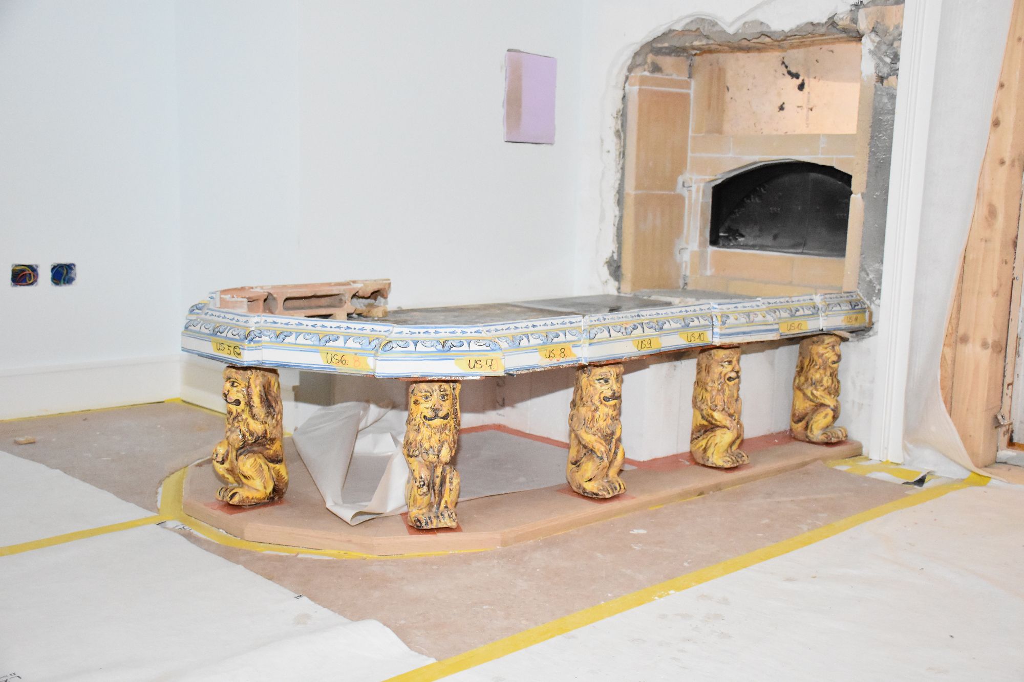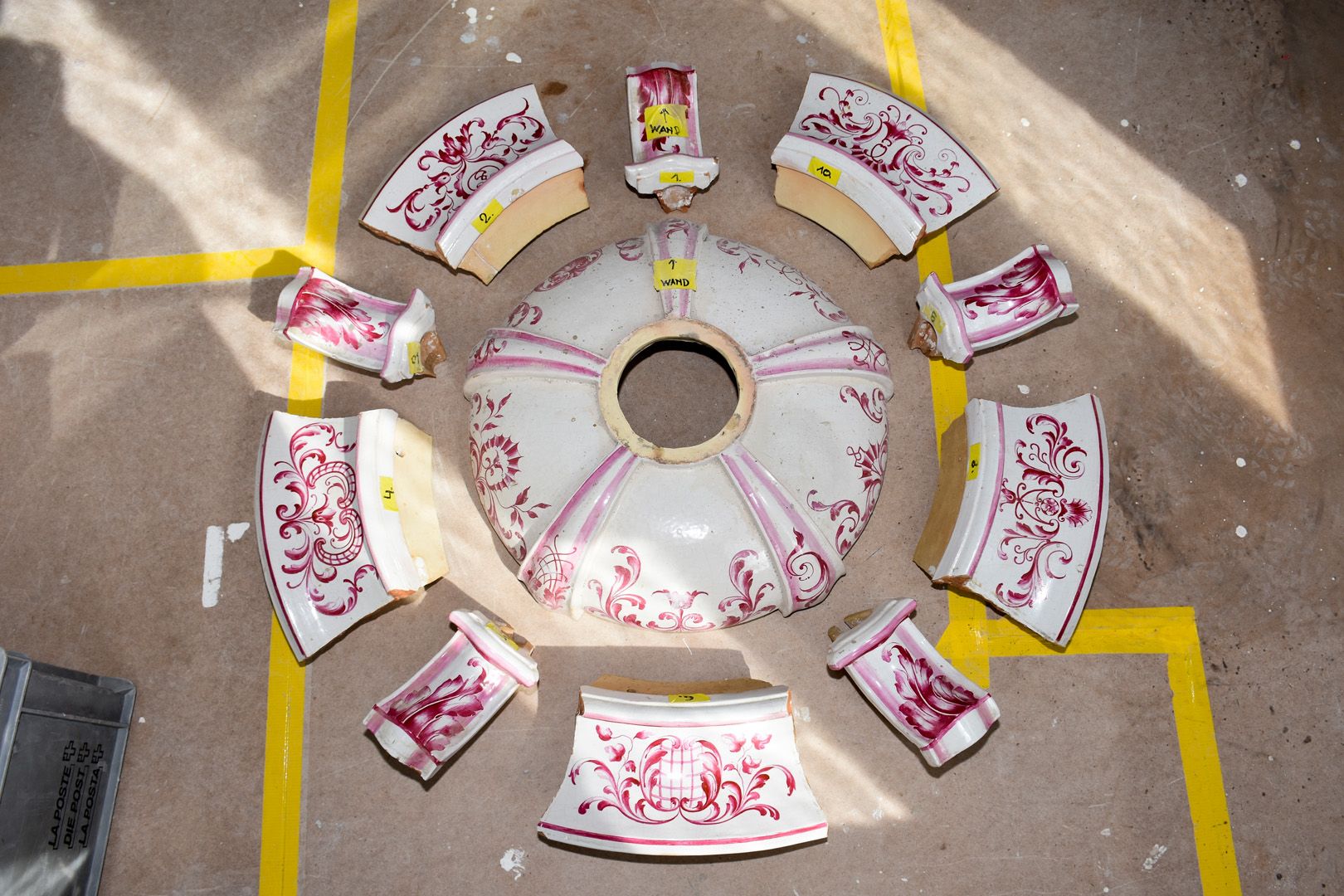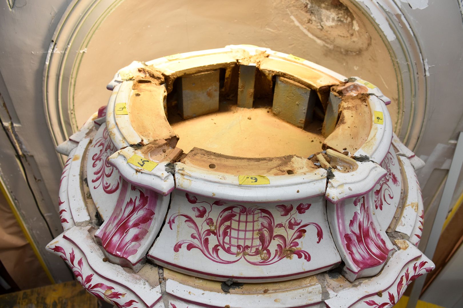 Bevor ein antiker Kachelofen wieder aufgebaut wird, erfolgt eine gründliche Reinigung der Ofenkacheln und eine technische Instandsetzung, um einen präzisen Aufbau und eine einwandfreie Statik zu gewährleisten. Nach dem Aufbau werden, falls erforderlich, Glasurabplatzungen an den Kacheln oder Übergänge zwischen einzelnen Kacheln sorgfältig retuschiert.