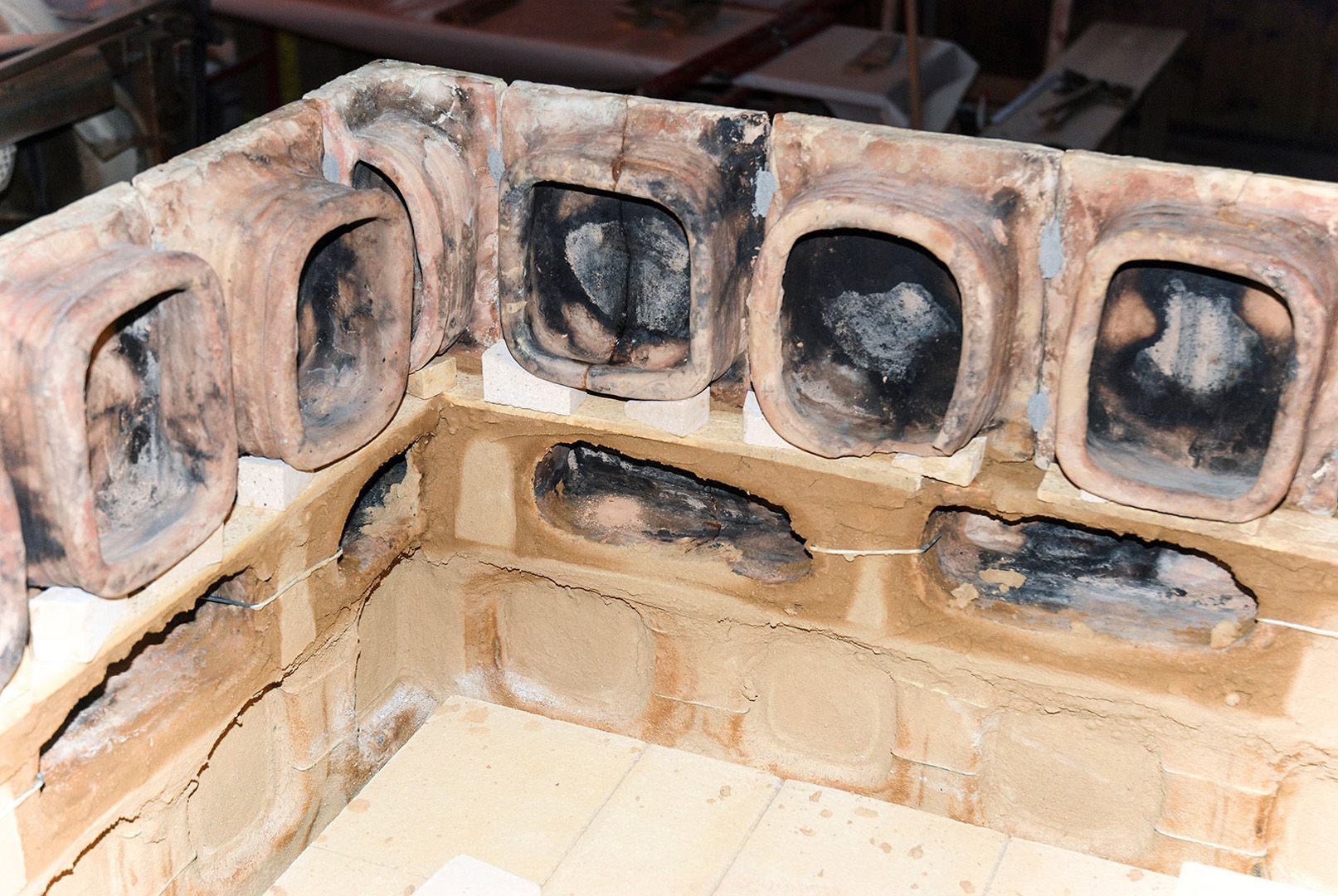 Vor dem Aufbau werden die Ofenkacheln gründlich gereinigt und technisch instand gesetzt, um einen präzisen, fachgerechten Aufbau und eine einwandfreie Statik zu gewährleisten. Nach dem Aufbau werden bei Bedarf Glasurabplatzungen oder Übergänge zwischen einzelnen Kacheln sorgfältig retuschiert.